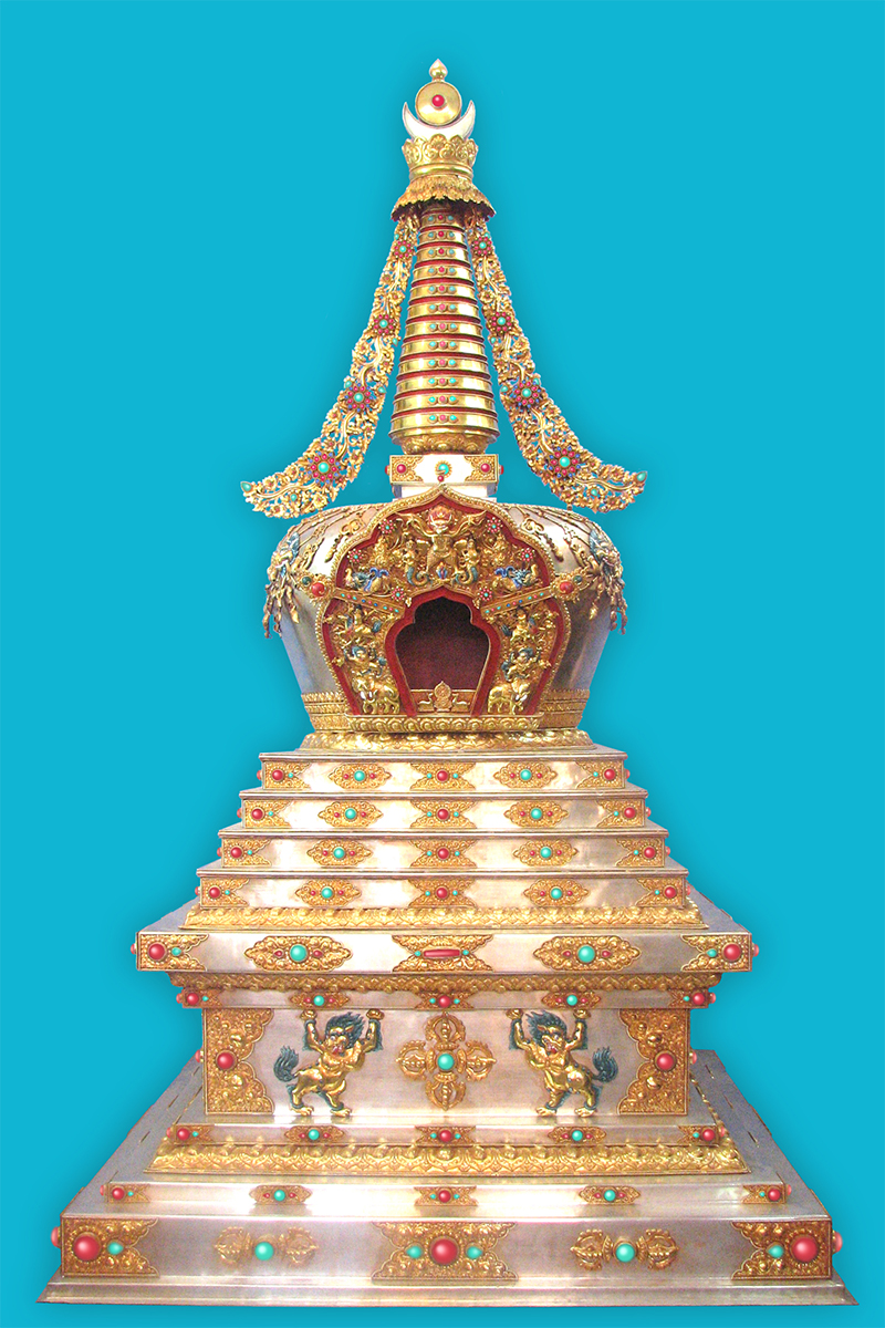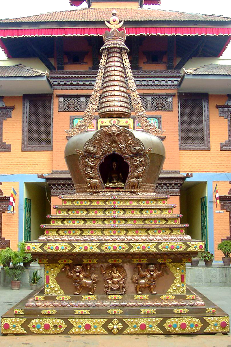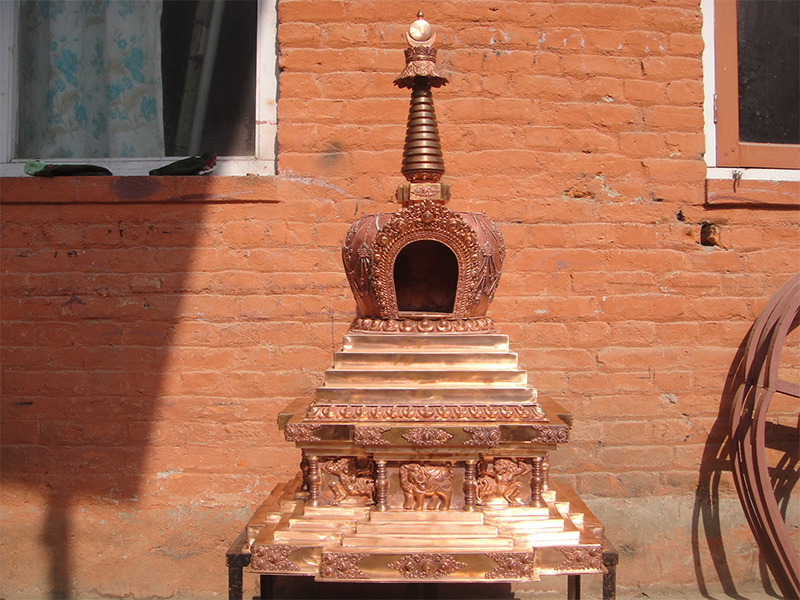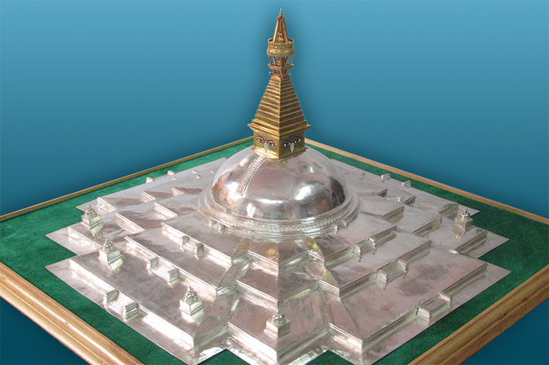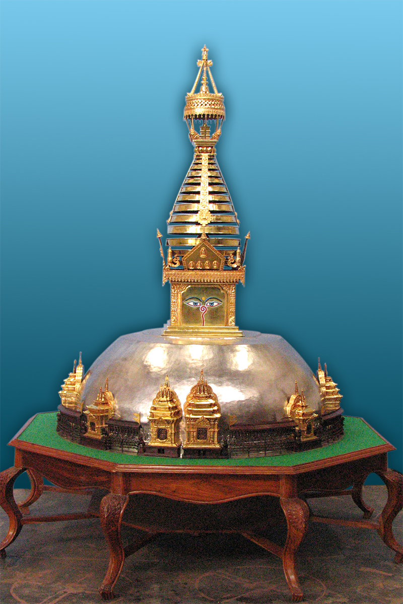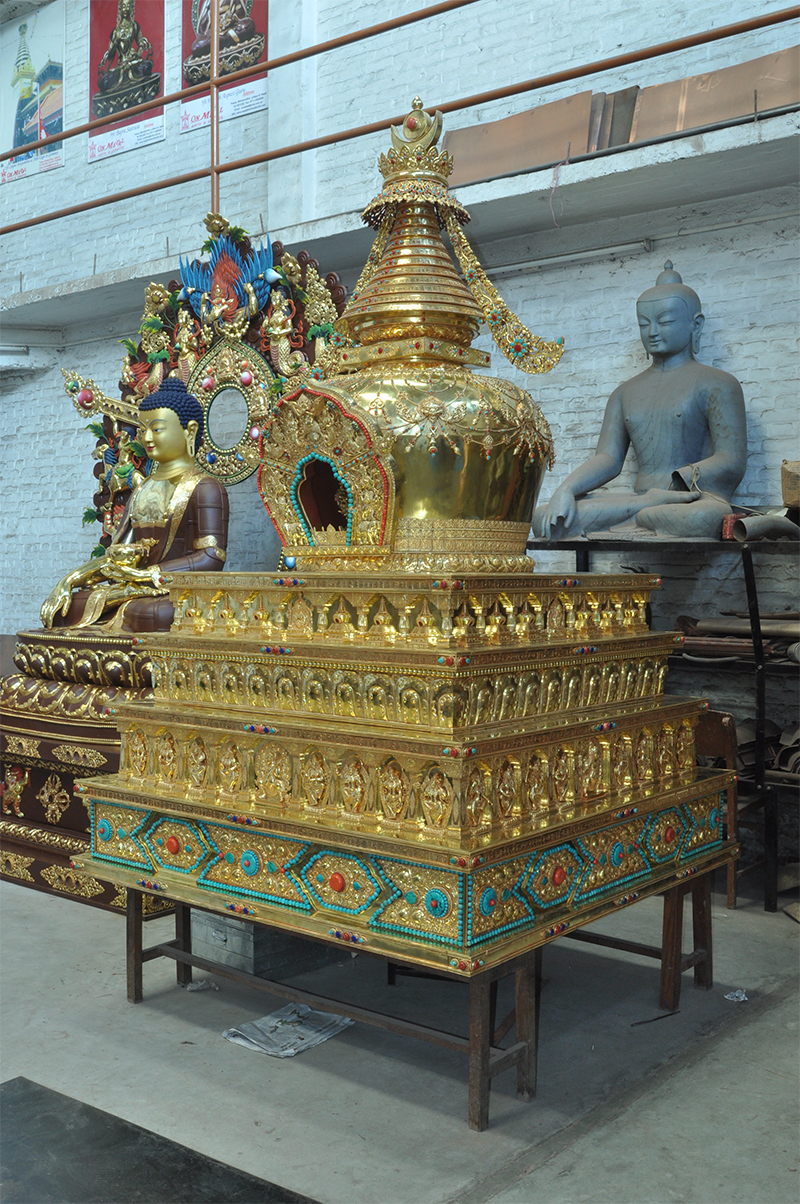The Nepalese and Tibetan stupas are made of copper and gold plated artifacts and decorated with various stones.