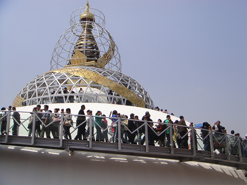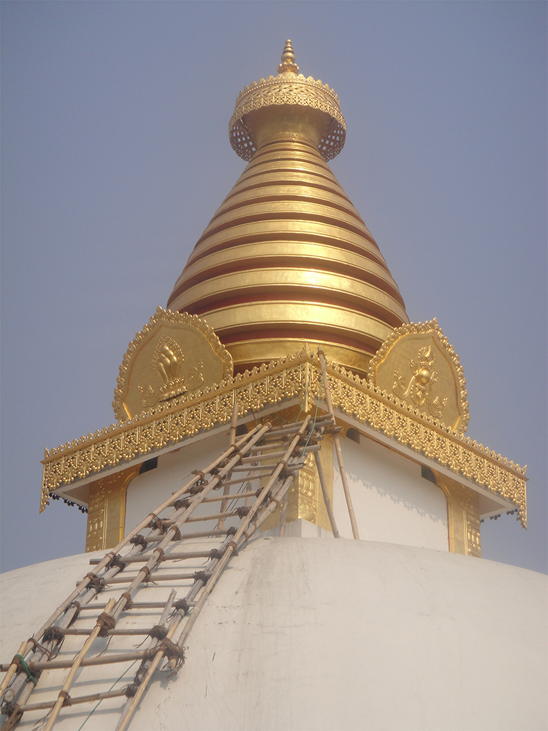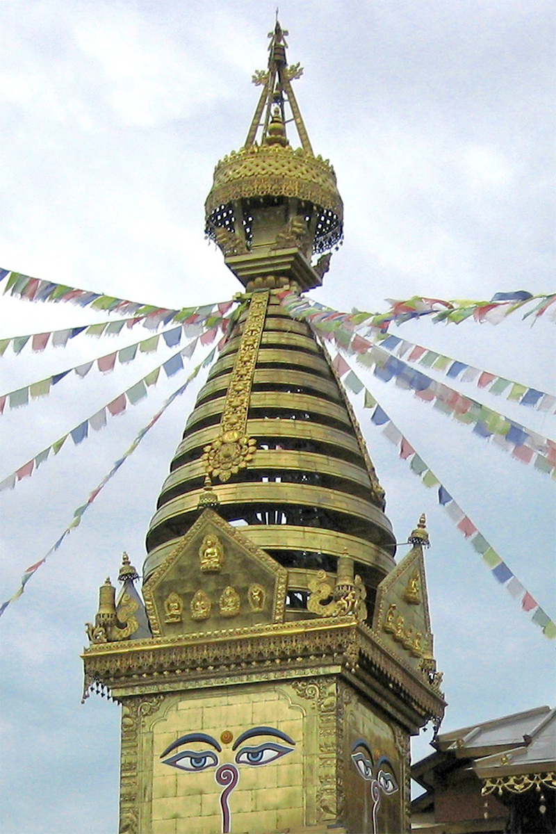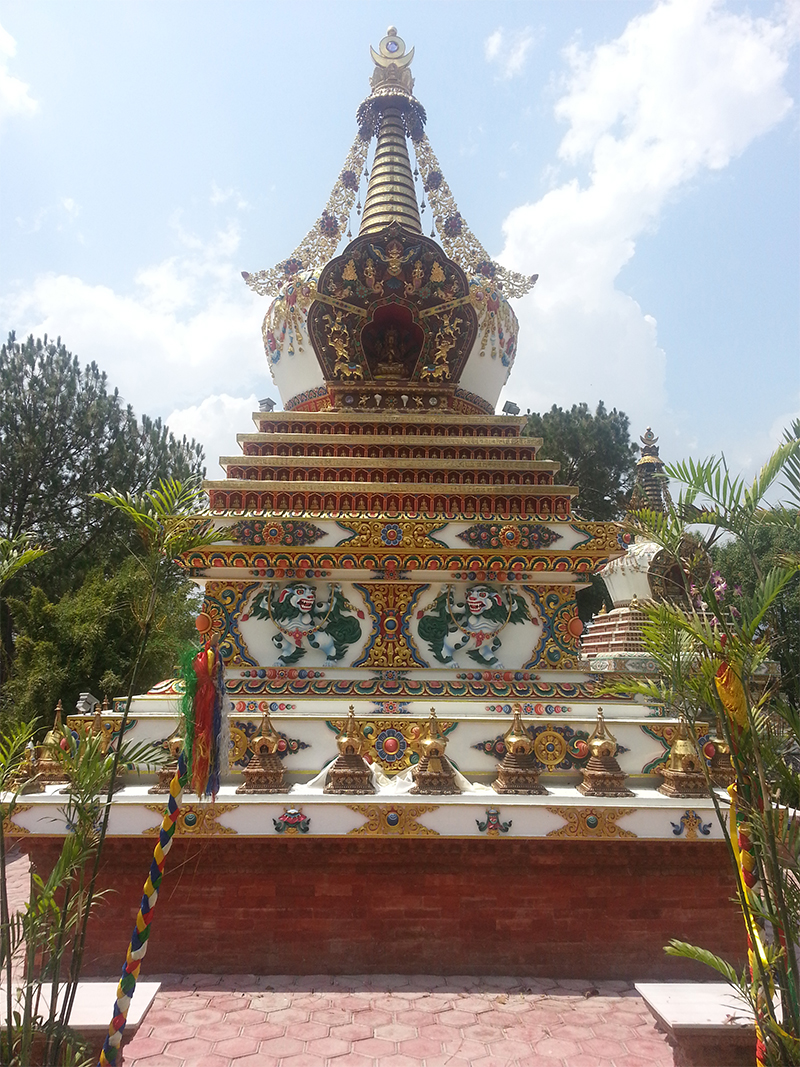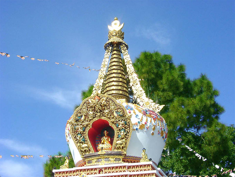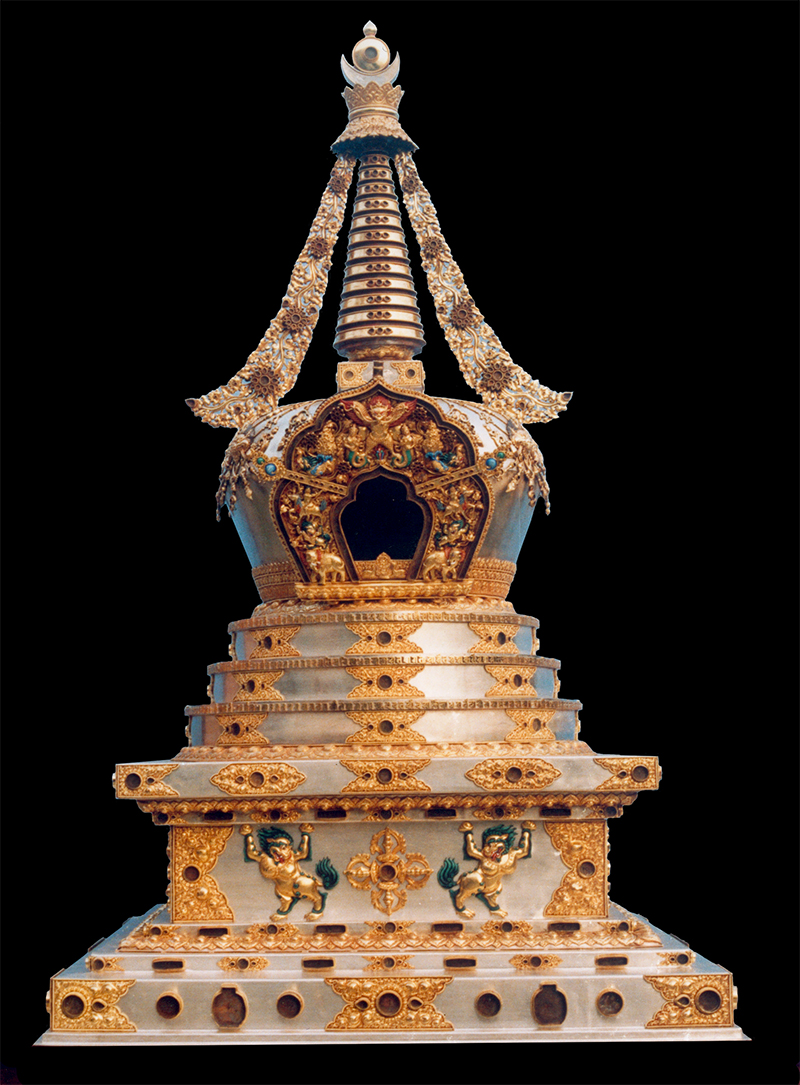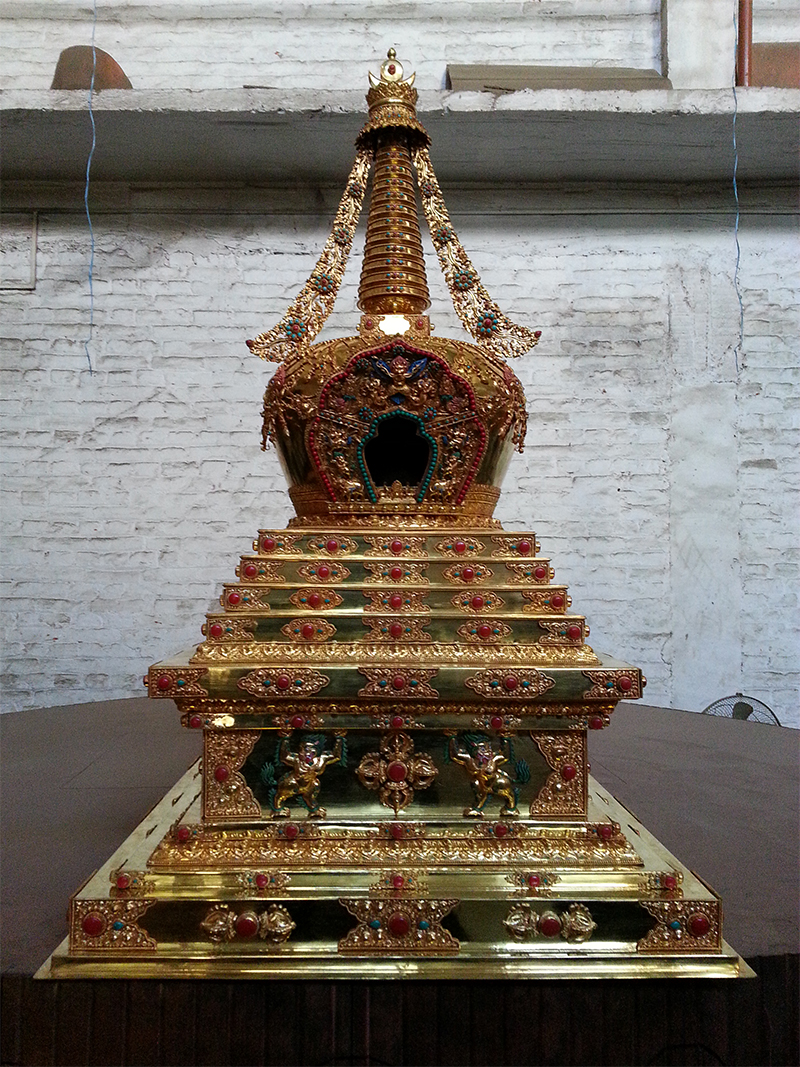 The Nepalese and Tibetan stupas are made of copper and gold plated artifacts and decorated with various stones.