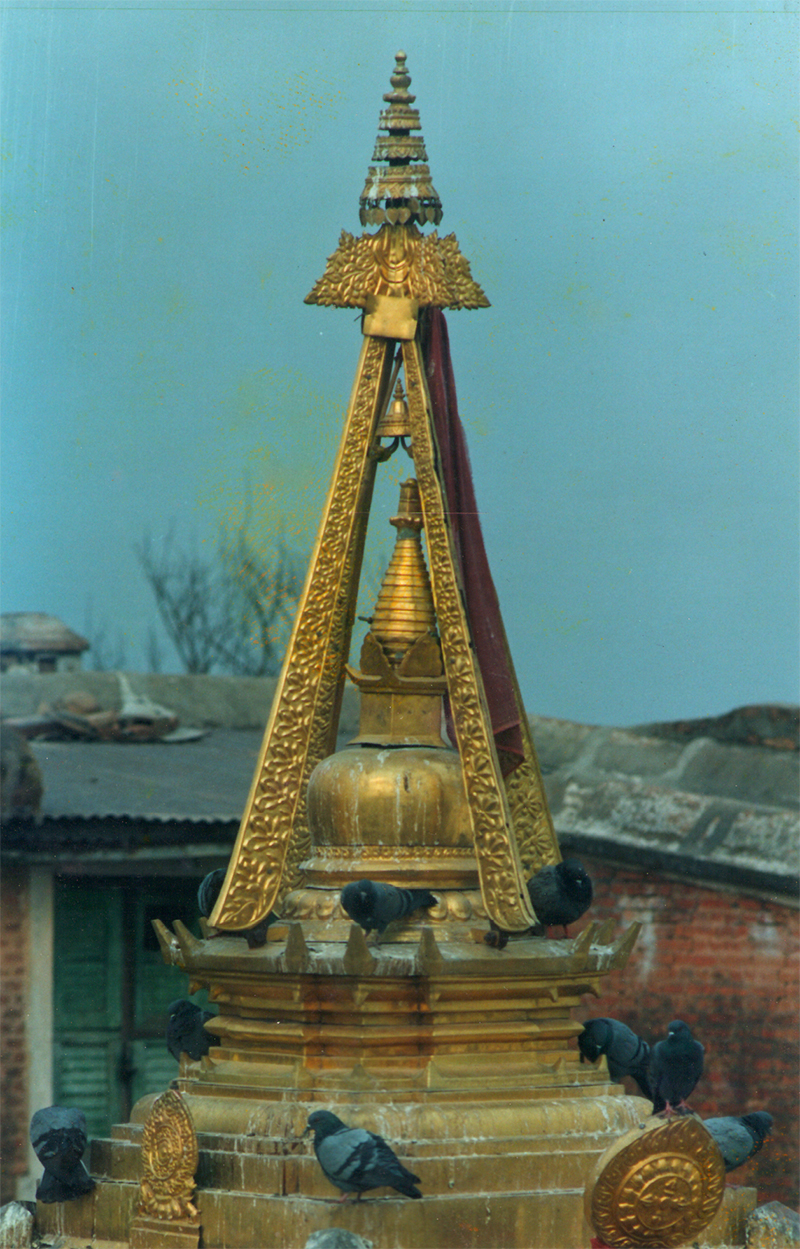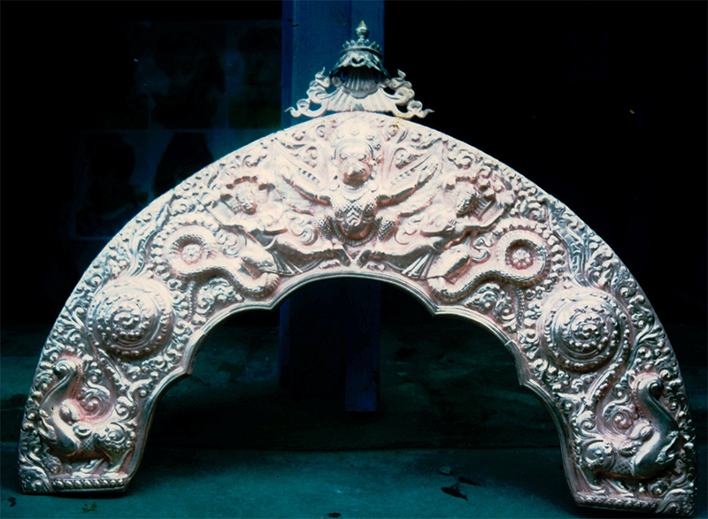The metal work is an essential part of temples, Mahabhihars and Gompas. Generally the gajurs, roof, pinnacle, Ilan ( Ceiling decoration ) and torans ( entrance gate decoration ) of pagoda temples are made from copper and, if required, are gold plated.